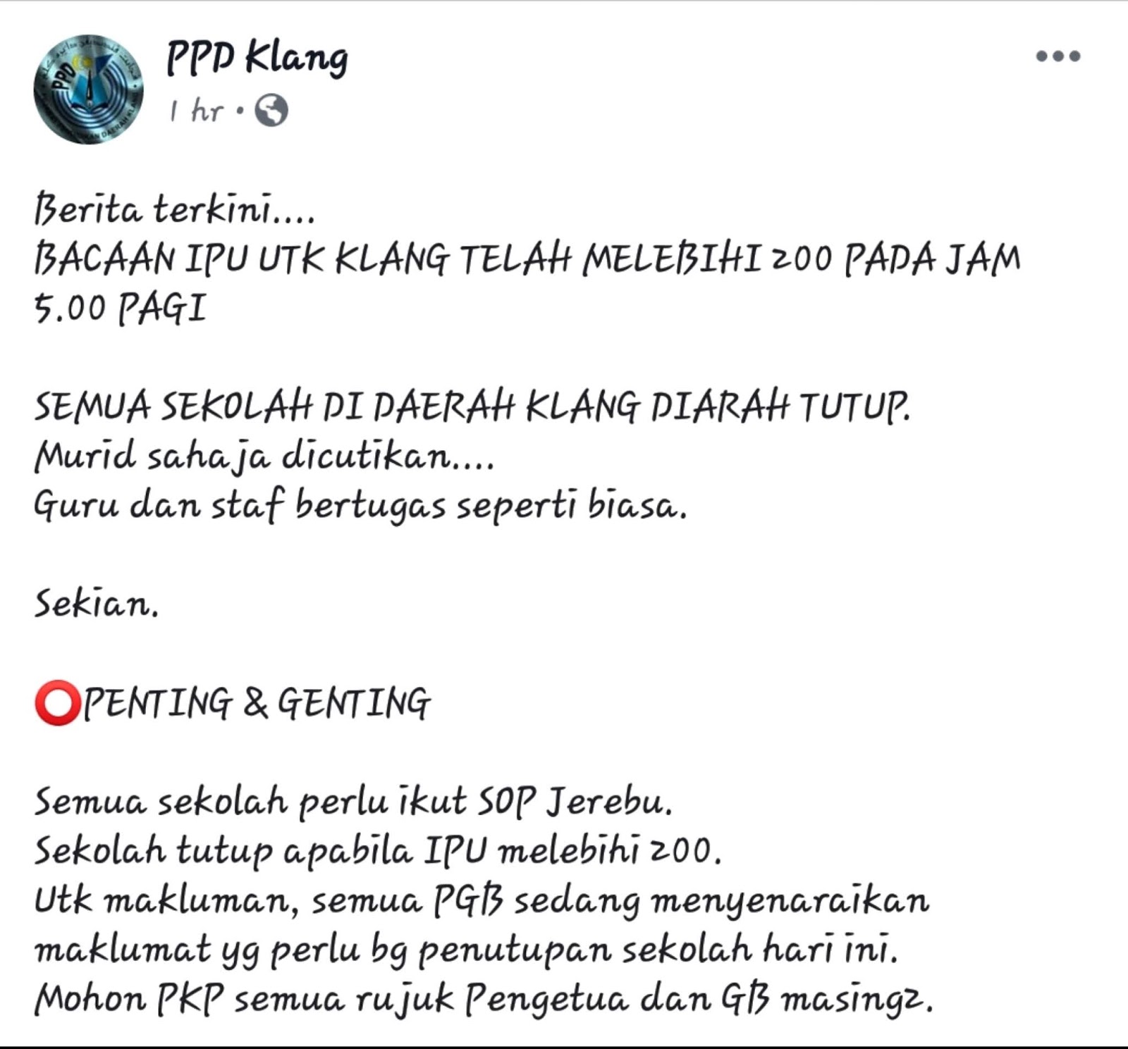 N1 3 Sekolah Di Johan Setia Klang Ditutup Kualiti Udara Sangat