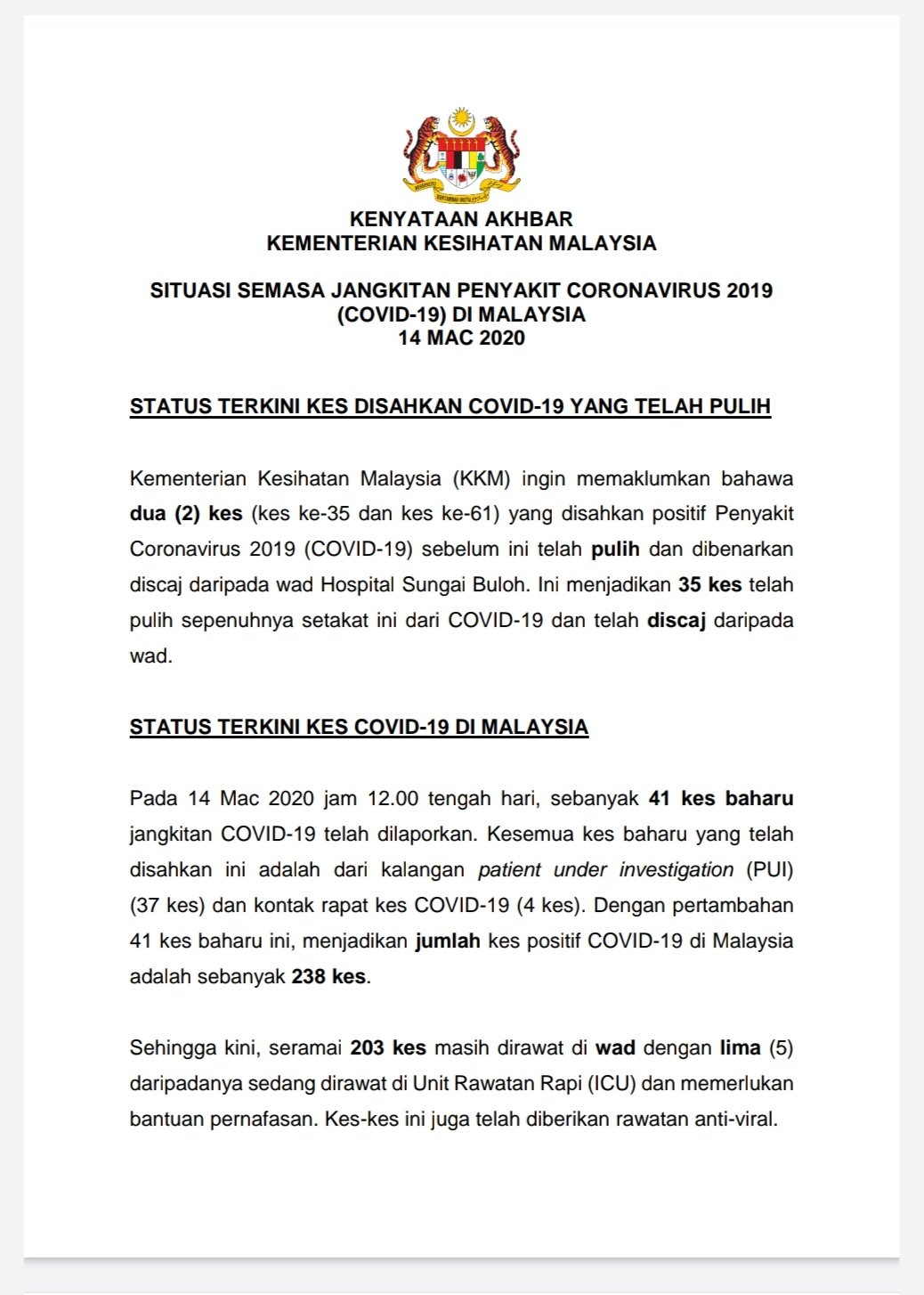 Kkmputrajaya On Twitter Situasi Semasa Covidー19 Di Malaysia 14 Mac 2020 1 41 Kes Baru Menjadikan 238 Keseluruhan Setakat Ini 2 Dua Kes Telah Sembuh Menjadikan 35 Pesakit Telah Sembuh Dan Discaj